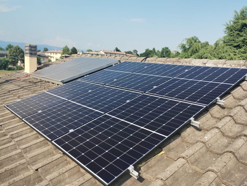 Realizzazione: questo impianto è composto da 14 moduli fotovoltaici Longi da 440 W per una potenza totale di 6,16 kW. L’inverter ibrido monofase HUAWEI è da 6 kW con potenza d’accumulo da 10 kWh.